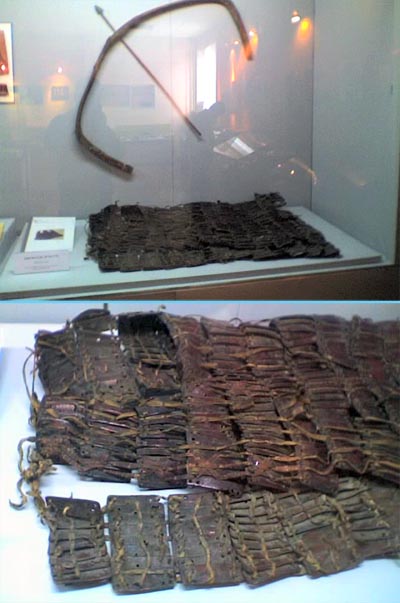 Лук и стрела, защитный "куяк" монгольских воинов XIII века сделанный из обработанной тельячьей кожи. (археологическая находка)