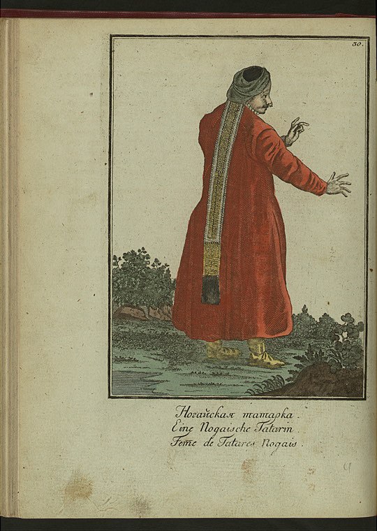 "Ногайская татарка" (ногайка). Иллюстрация из книги "Описание всех обитающих в Российском государстве народов". 1799 год. Архив Нью-Йоркской публичной библиотеки.