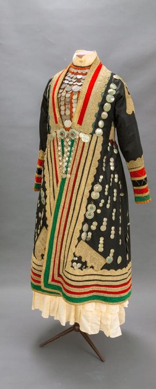 Размер Дл.: 115 см; подол: 213 см; дл. рукава: 43 см; шир. у кисти: 22 см Материал, техника Сатин, сукно, бархат, позумент, металлические штампованные бляшки, серебро, смальта, стекло, сшито вручную, сшито на машинке