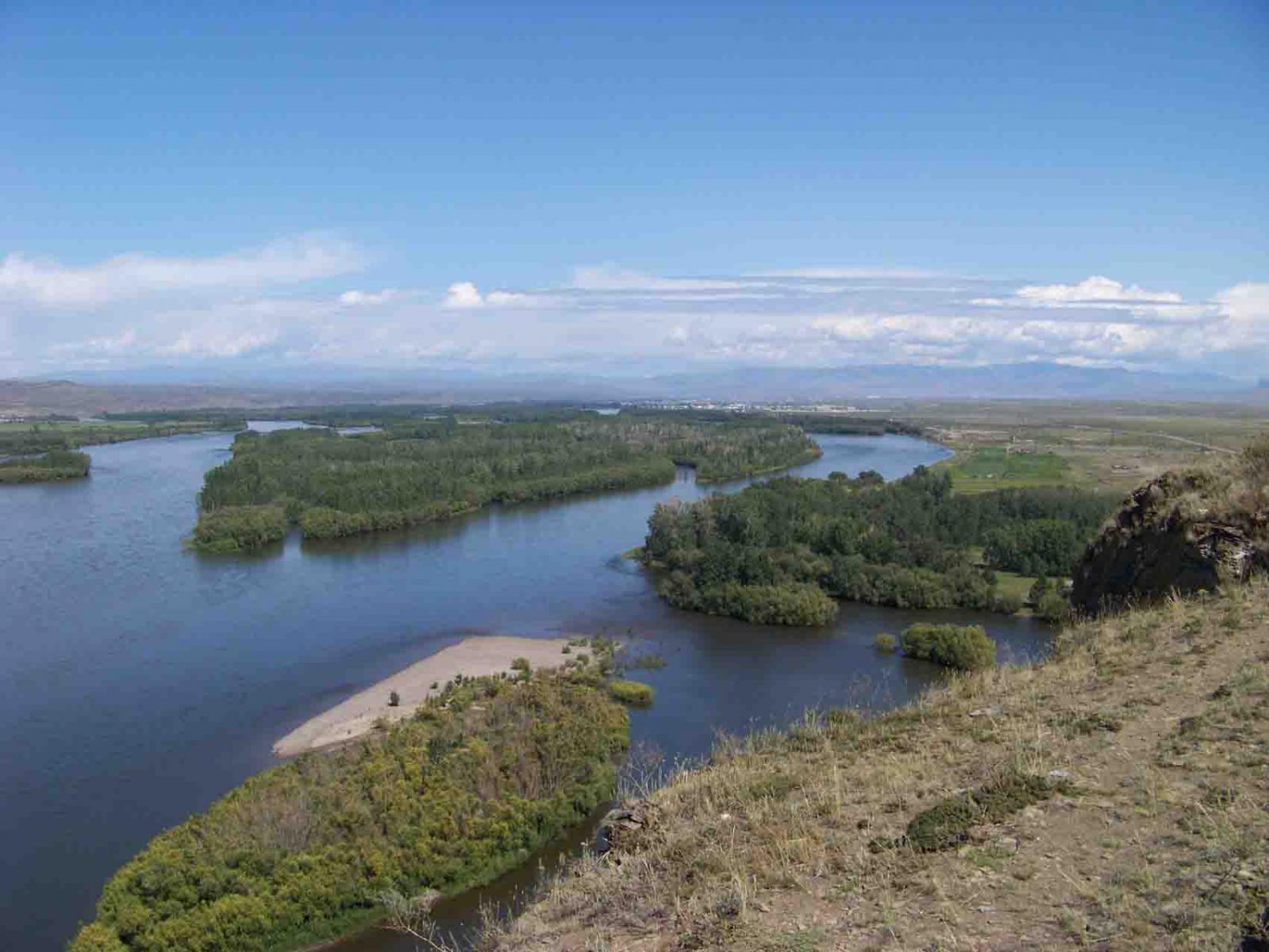 Великий Улуг-Хем, Енисей, Эне-Сай. В тувинской котловине. Вдали виднеется город Кызыл - столица Тыва Республики